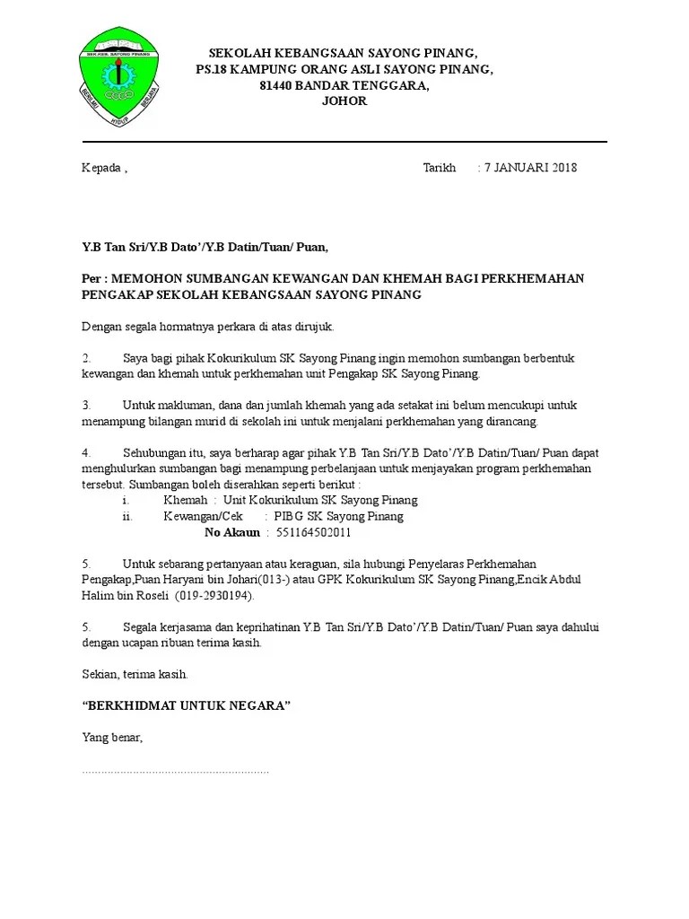 Contoh surat mohon peruntukan dari yb yang berhormat adun contoh surat mohon sumbangan penajaan lawatan sambil belajar. Contoh surat mohon sumbangan yb 19 7. Contoh surat rasmi permohonan bantuan peralatan rasmi sua. Sarawak · yb encik abdul wahab bin aziz,.